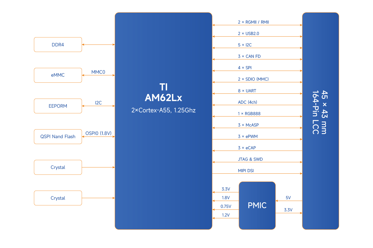 | Processor | TI AM62Lx:Dual-core Cortex-A53@1.25GHz(AM62L32BOGHAANBR) |