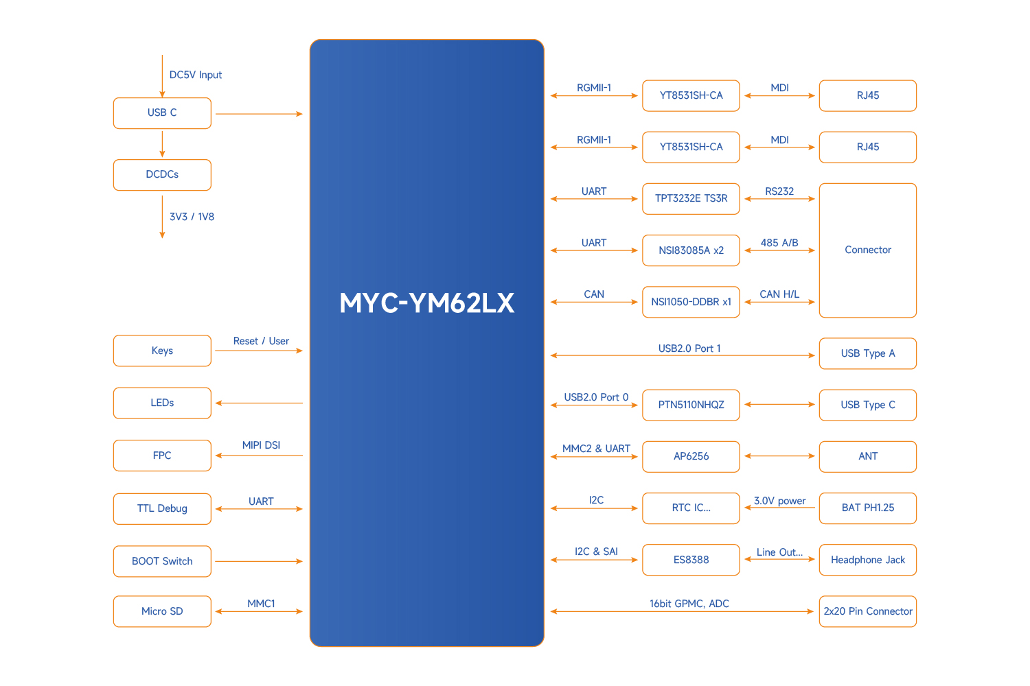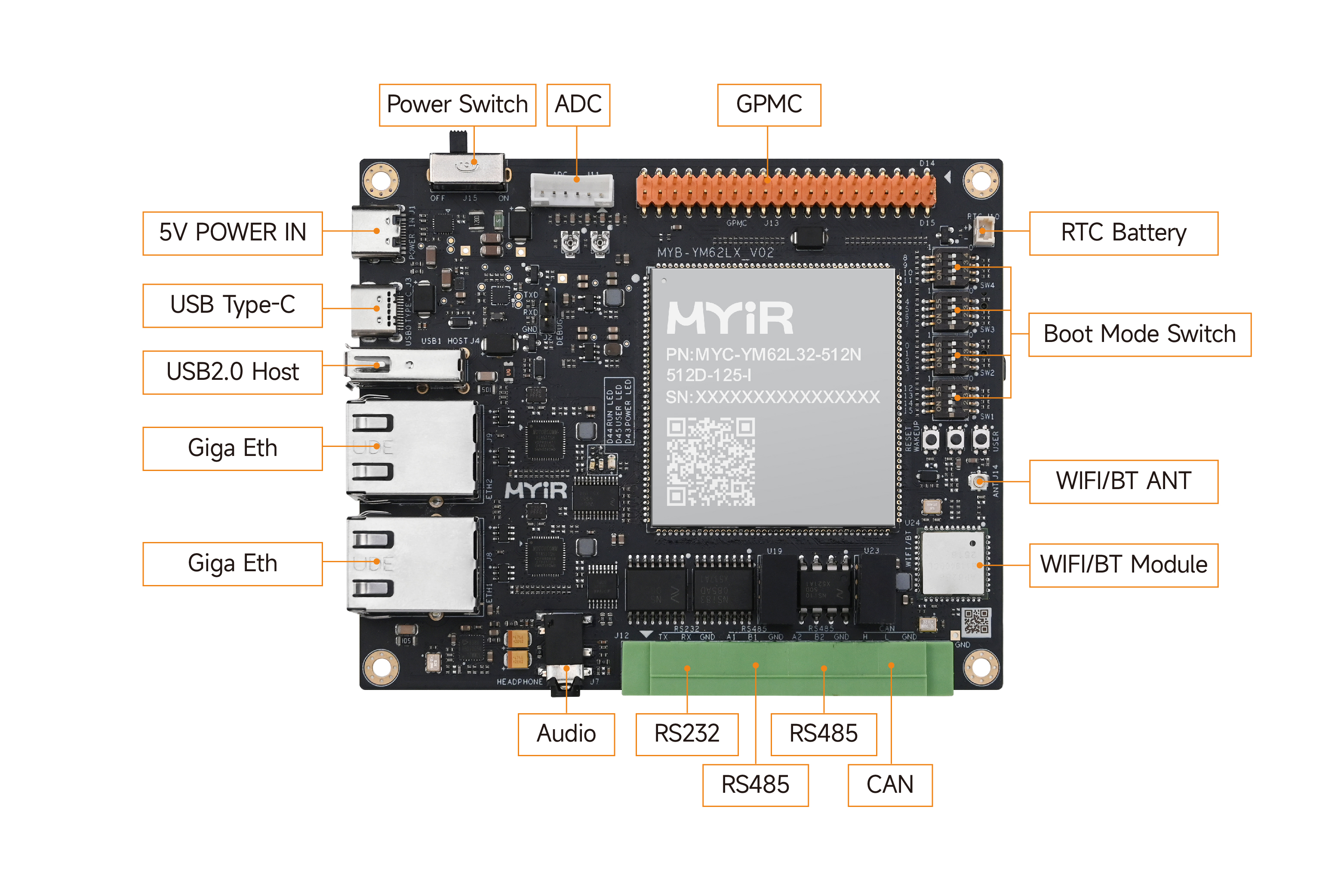 The MYD-YM62LX development board integrates the MYC-YM62LX System-On-Module (SOM) with a dedicated carrier board, connected via a 164-pin expansion interface. The carrier board features a double-sided component layout and delivers comprehensive connectivity, including dual Gigabit Ethernet, one USB 2.0 port, one USB 2.0 Host port, one RS232, two RS485, one CAN interface, and 4-channel ADC. It also supports WiFi/Bluetooth via an onboard module, MIPI-DSI display output, and audio input/output. For enhanced development flexibility, MYIR offers the MY-MIPI101C-V2 10.1-inch LCD Module as an optional accessory compatible with the MYD-YM62LX board, enabling a streamlined and effective development experience.